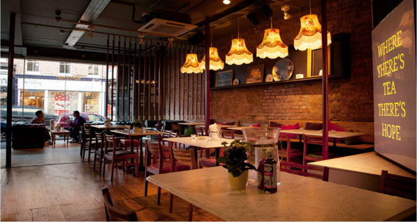 Soups, salads, cakes and specialty teas in split-level, exposed brick cafe bar with stripped floors.
