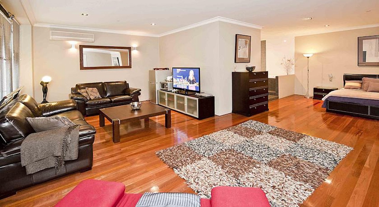This luxurious one bedroom apartment boasts a spectacular city view of the Perth Arena, Kings Square, His Majestys Theatre and a host of different city buildings. The apartment itself has a fully equipped kitchen/lounge/cinema/dining/cocktail areas. The main bedroom has a large spa bath and double vanity, wall to wall built in robes and a little New York style balcony off the bedroom. The apartment has shower, bidday, toilet and powder room with a large vanity and toilet. All the modern cons, large flatscreen TV, blueray video in the cinema area streaming movies and surround sound, and in the bedroom another flatscreen TV, blueray and also streaming movies.