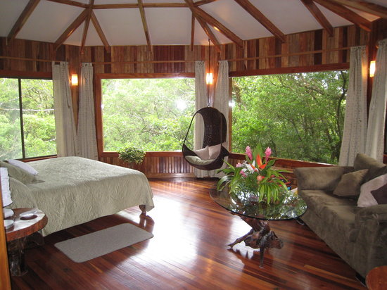 If you are considering a stay in the cloud forest in world-famous Monteverde, Costa Rica, visit us--you won't be disappointed. If you want to wake to the sound of birdcall in a romantic, oversized bed made of tree roots, bathe in your own personal spa or waterfall fantasy shower made of stone, be pampered with fresh-baked goods and massages, and experience the sensation of direct contact with nature from a safe haven all integrated into one location, this is the place for you.