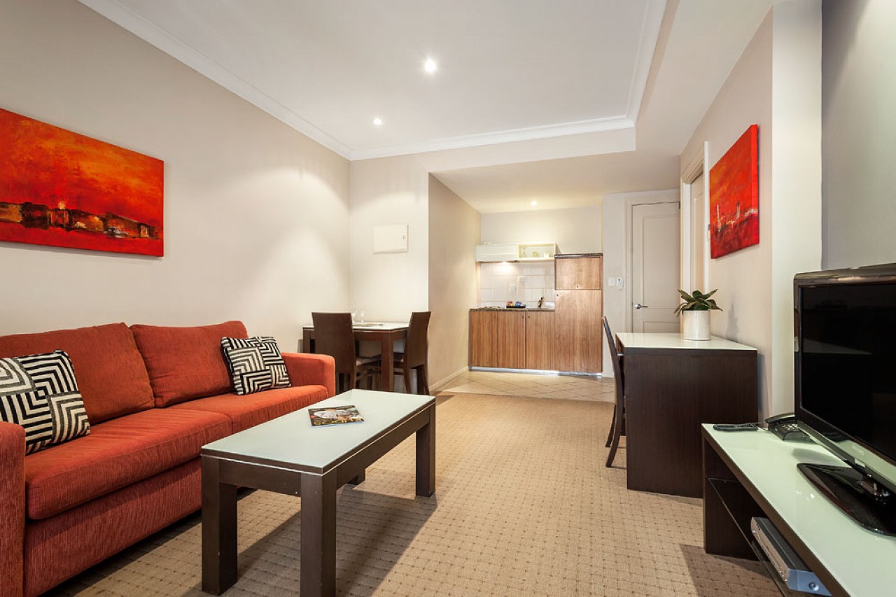 Feel right at home in the One Bedroom Apartment. There’s space to move, with a separate bedroom featuring comfortable double bed and wardrobe. The relaxed living area contains a sofa, LCD TV with Foxtel and work desk, whilst the kitchenette provides a cooktop, a bar-size fridge, and dining table. The bathroom offers amenities and hair dryer. A daily housekeeping service is included (excluding Sunday and public holidays). Gym access, breakfast and restaurant options are available.