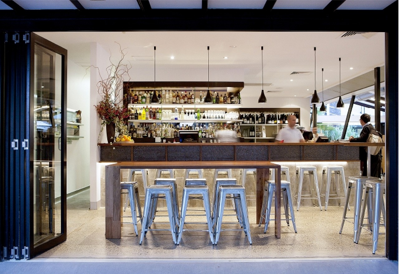 Though under cover, the dining area has an alfresco feel, which is achieved by glass walls and modern horizontal slat windows. Mornings are a whiz of newspapers and busy waiters. The smells of fresh ground coffee and lean bacon fill the air and the sounds of frothing milk and the clink of knives and forks can be heard above the chatter of the clientele.
