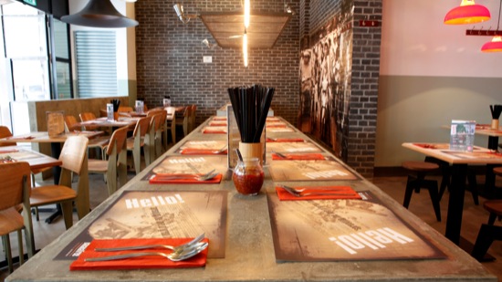 Food from the Indochina region in a canteen-style venue with an open kitchen and communal tables.