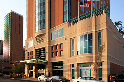 Embassy Suites Houston-Downtown is a high-rise hotel overlooking Discovery Green Park. The 262-suite downtown Houston hotel is only steps away from the Houston Center Business District, the George R. Brown Convention Center, Houston Astros Minute Maid Park, Houston Rockets Toyota Center, Houston Dynamo BBVA Compass Stadium, GreenStreet Entertainment Complex and the Park Shops at Houston Center.