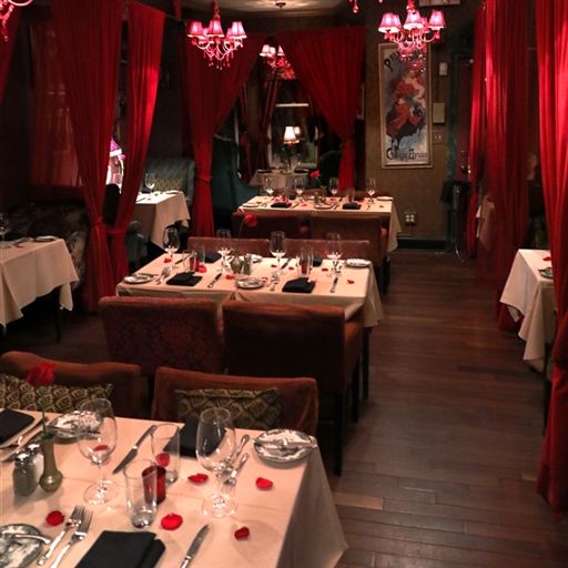 Antique decor & curtained booths plus French bistro fare make this townhouse a romantic destination.