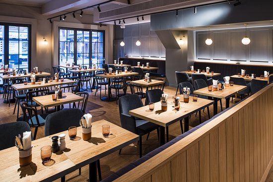 Modern European bistro cuisine in a former fire station with exposed brickwork and an open kitchen.