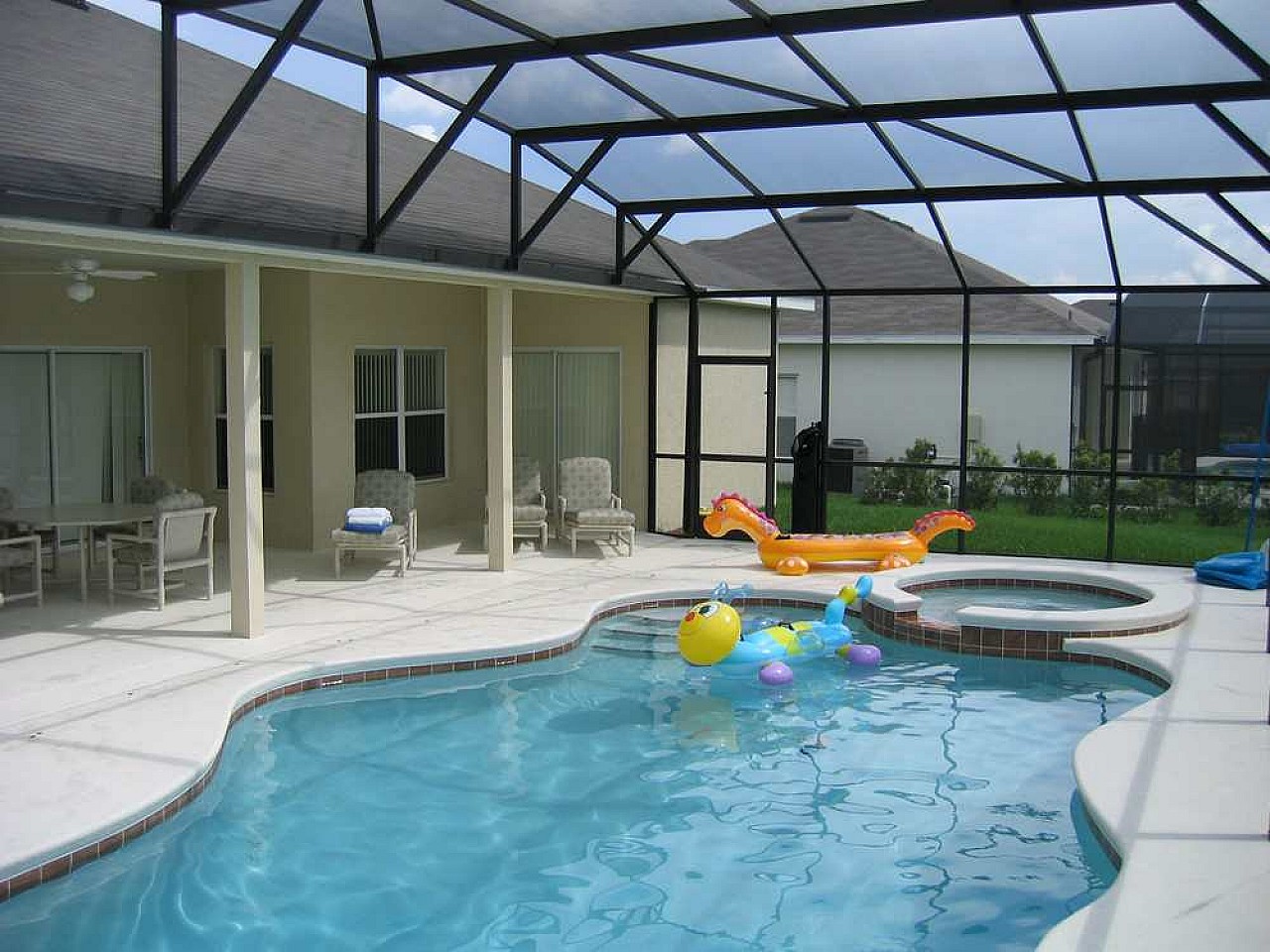 Our 4 bedroom 3 bathroom villa sleeps privately up to 8 people. One of the two master bedrooms has been made wheelchair accessible with wider doors and a roll-in shower for our guests with disabilities. The second master has it's own en-suite and the two twin bedrooms share a third bathroom which, also acts as a pool bathroom. A fully fitted kitchen, extended lanai with beautiful poolside furniture around the screened pool and spa. Also on this prestigious gated community are a tennis court and a children's playground with a cabana.