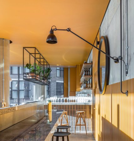 With a balance of design there is stripped back feel with half painted concrete and carefully chosen furnishings A bare steel spiral staircase leads to the first-floor restaurant and bar.