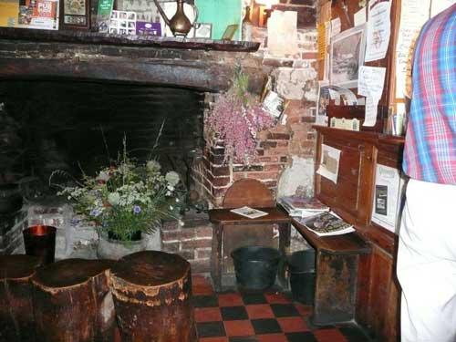 There are two bars. The “public” on the left is Tudor, with beams, tiled floor, an original inglenook fireplace, a couple of scrubbed tables, wooden benches, tree-trunk stools and a “library”. The saloon, or Smoking Room, as it is called, is a Victorian addition, as is the servery where beer is dispensed from traditional barrels by tap.