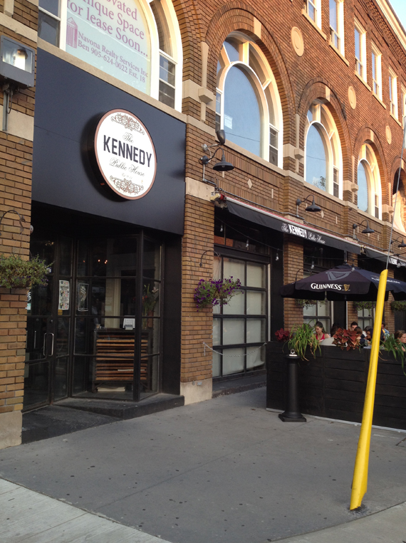 Leading up to the entrance of The Kennedy Public House is a small ramp. No automatic button and the door is 32 inches wide. Indoors this gastropub offers varied seating options that create depth to the space. The 9 tables along the right side would be the most accessible with a standard height of 28 inches. A clear pathway leads you to four washroom stalls, one of which is a large private family style room. The room has a 34 inch wide door with an appropriate handle on the outside and inside. Automatic dryer, 2 grab bars and 40×50 inch space in front of the toilet.
