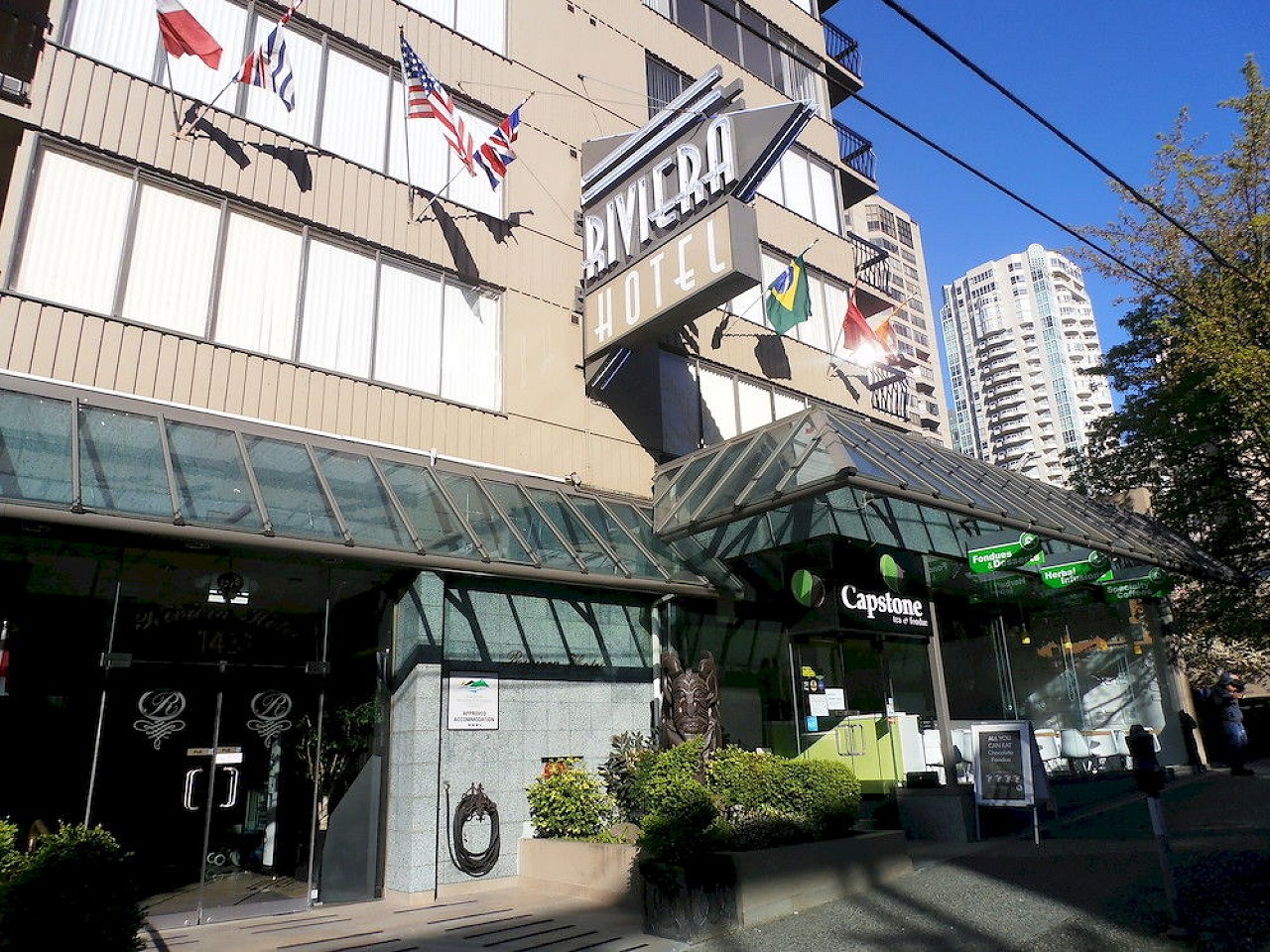 Riviera Hotel on Robson is located in the West End of downtown: conveniently steps away from the beautiful world-renowned Stanley Park (7min) and the dynamic business district (5min). Take a tour of Robson street and experience the finest restaurants, glamorous shops, and bustling nightlife right outside our front door.