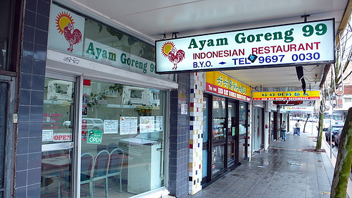 Step off the street and take a short trip to downtown Jakarta with the crowd that flocks daily and nightly to Ayam Goreng 99. This restaurant transports you to an Indonesian local eatery with the prices to match. The general hubbub is a mixture of indecipherable Asian and Australian tongues so, to avoid miscommunication, paper and pens are placed on your table so that you might write down your order for the wait staff.