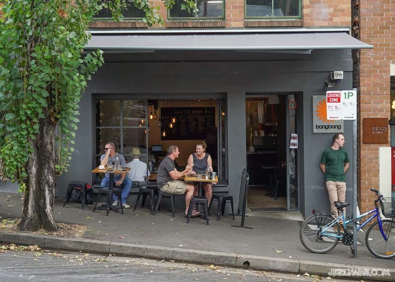 Bangbang is a bright, cool café at the quiet end of Reservoir Street nestled amongst the terrace houses of Surry. It does a serious weekend breakfast trade, with loyal patronage since its modest debut. A retro Brit-inspired menu of black pudding, bacon butties, posh fish fingers and more is well-executed along with their own smooth Golden Cobra blend. Former DJ Alan Thomson has installed silver drum stools as chairs and a mural depicting oversized headphones on the café's main wall. Bangbang is a just a cheeky couple of girls and guys who serve up simple, delicious, breakfast classics. We craft some of the best burgers you will taste in Sydney and supply some smooth specialty coffee from our friends Five Senses. Escape the pressures of life and let us sooth you with 70's classics and some of the most ordinary chat you will ever hear. Bangbang is an experience which will stimulate and satisfy all of your senses. It's like spending the day with Ryan Gosling.