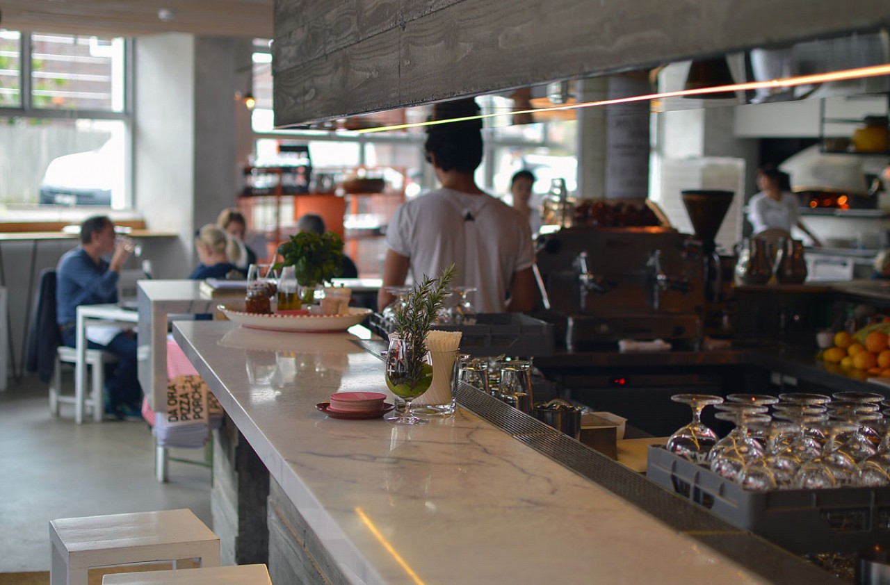 A whole Berkshire pig takes prime position on the bench of the open kitchen, a great marketing ploy to convince hungry diners what to order. A bevy of young chefs, including Orazio D’Elia, flamboyantly spin dough in the air (which has naturally risen for 48 hours) for each individual pizza order before being delivered to the 2.7 tonne pizza oven, imported from Napoli.