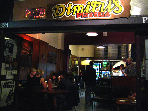 Dimitri's Pizzeria restaurant has stood the test of time on Crown Street, dishing up mouth-watering pizzas to Surry Hills locals for more than three decades. A tempting collation of pizza options is accompanied by sidekicks of pasta, salad and lasagne. If the packed interior and pizza-gorging punters jostling for space on the public bench outside are any indication, Dimitri's is one popular little pizzeria. Opened in 1975, this old gem is treasured by Surry Hills locals who fill the interior every night of the week, making use of the BYO policy with bags of beers and bottles. Passing by the Crown Street digs of an evening, the aromas coming from the pizza oven are enough to send an empty stomach into rapture. Owner-chef Dave Thompson reigns the petite dining room, its kitsch and quirky garb reflecting the restaurant's long tenure in the industry. An eclectic array of paintings and postcards dot the maroon-slicked and wood-panelled walls, as the resident goldfish eyes off the delights on the plates.