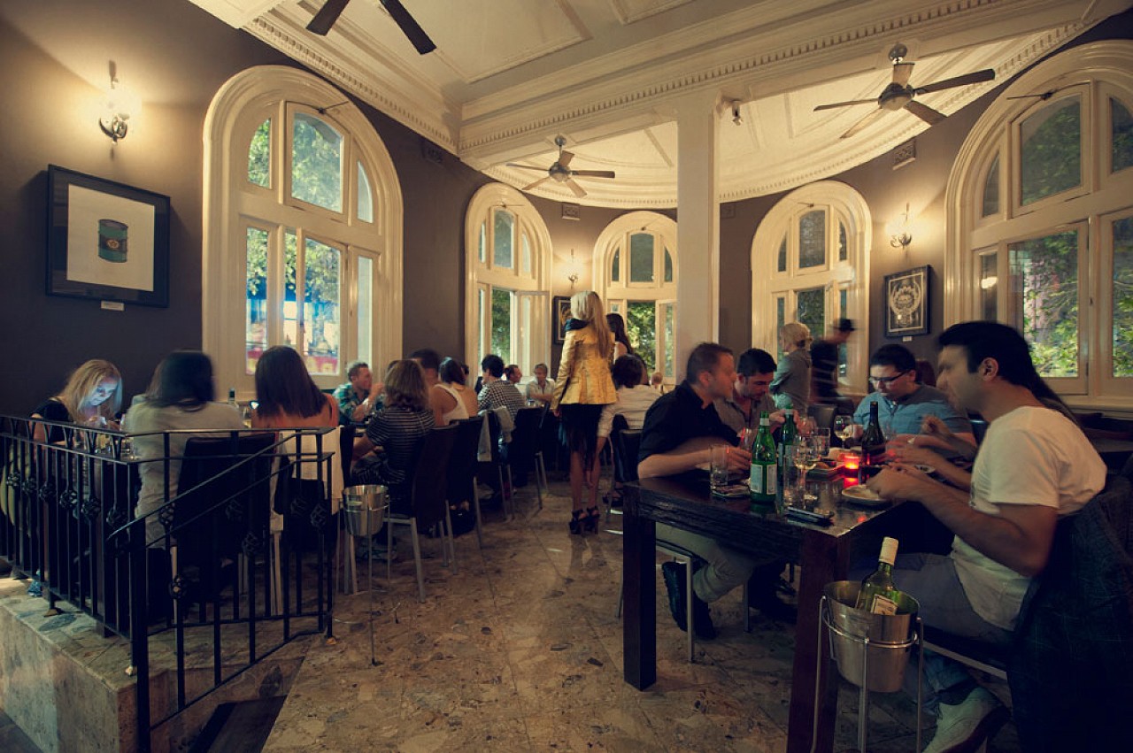 A kind of fusion décor sees the elegant structure crossed with the subtle style of a cushion room through banquettes that wrap around the curved walls and are lined with pillows. Shades of mauve are set off by orange and yellow lanterns glowing from the high ceilings, while tall arched windows lookout onto leafy trees that are as old as the building.