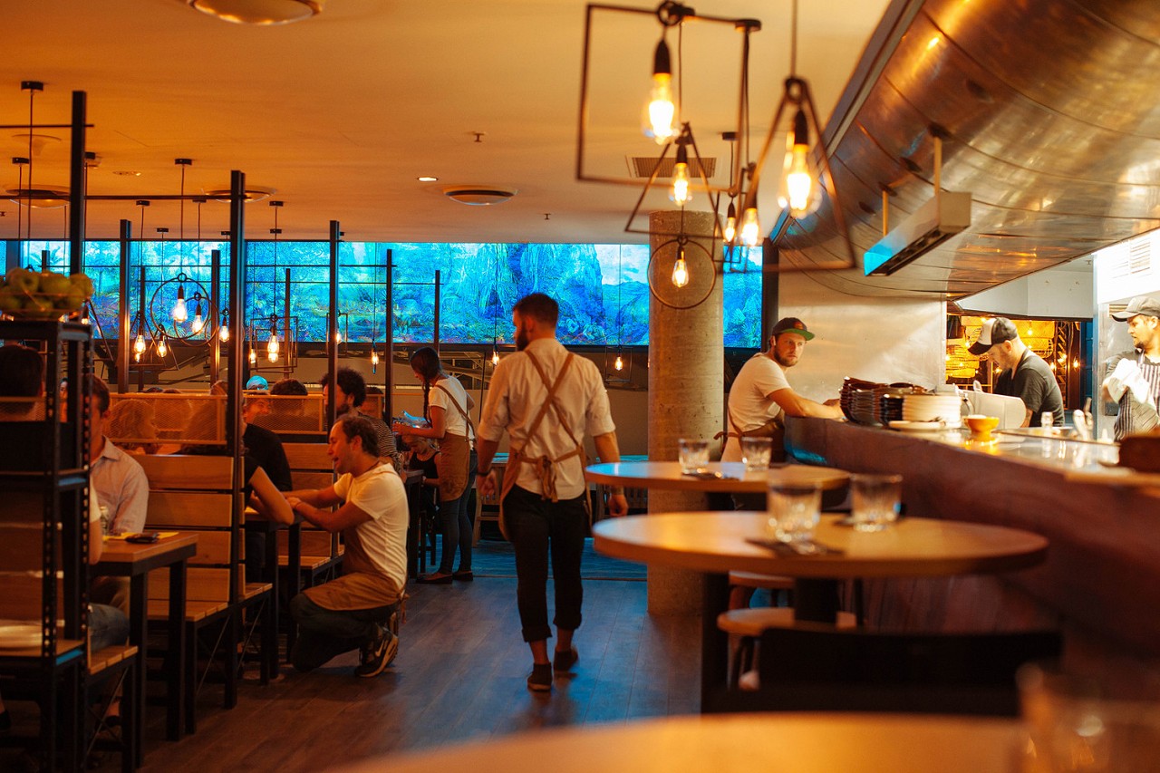 Dine on the wild side at North Sydney's Hunter Gatherer, a rooftop venture that focuses on using locally sourced ingredients to deliver a fresh and inventive range of dishes. The space embodies a rustic wooden decor, complemented by green foliage to create a farm-like feel. Dishes have a Middle Eastern flair with ruby jewels of pomegranate, smoky eggplant, and fresh haloumi.