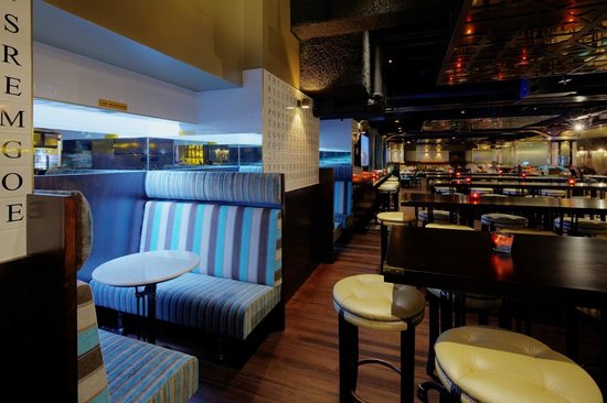 The room is open plan, with dining at one end and the pub at the other. The bistro area blends shabby-chic with Parisian-class, with round marble tables, shiny cushioned chairs and stripy brushed velvet banquets in muted tones of green, gold, red and blue. White, lettered wall tiles give a scrabble-style effect, with words like ‘Napolean' and ‘Croque Madame' hidden across.