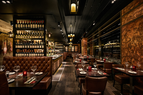 Brazilian rodizio dining room for all-you-can-eat steaks and skewered meats, carved at the table.